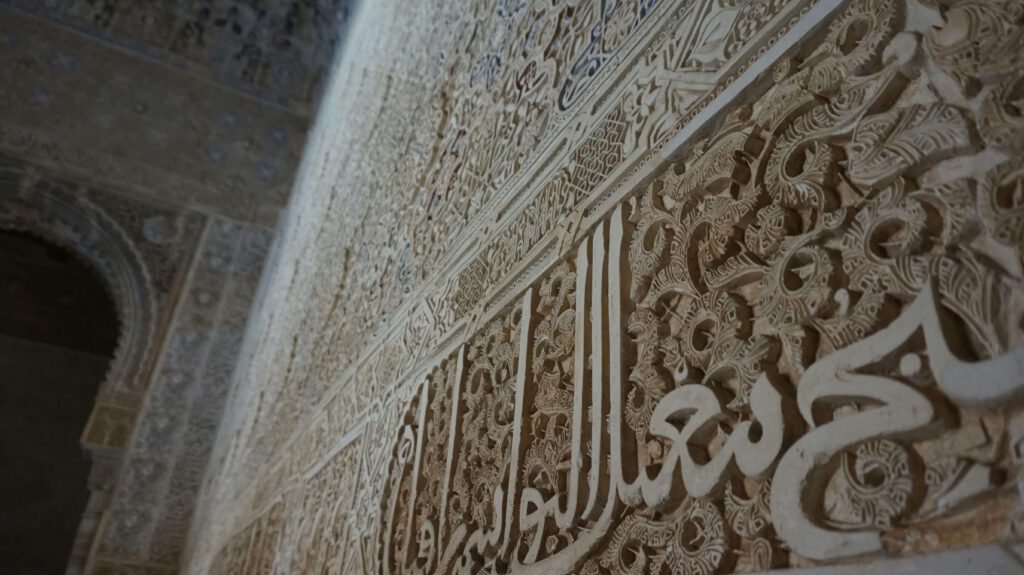 - Палац Насридів Головна перлина Альгамбри — це Палац Насридів, який вражає своєю розкішшю. Інтер’єри прикрашені різьбленням по гіпсу, арабесками та каліграфічними написами, що прославляють Аллаха. Особливо виділяється Зала Послів та Двір Миртов.